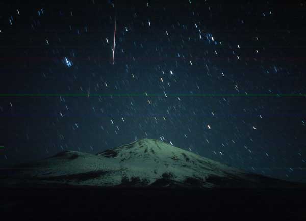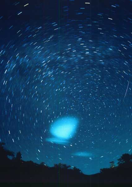 富士山に降るしし座流星群 流星雨となった2001年のしし座流星群です。 夜11時頃から流れ始めた流星は、夜明けの薄明が始まってもなお、流れ続けました。 一生忘れられない、天体ショーでした。 |