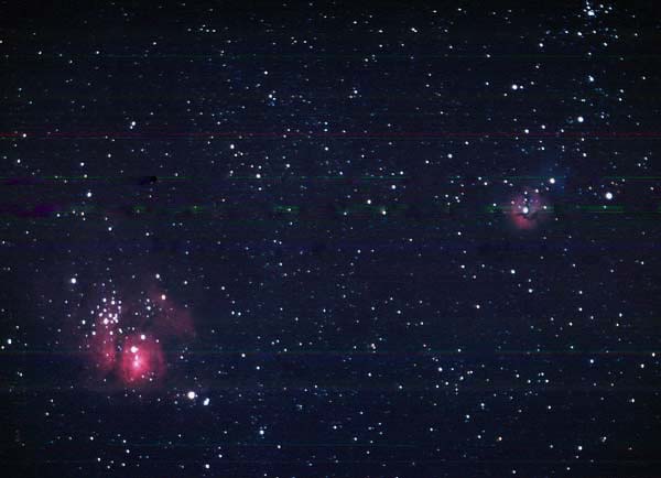 オリオン座大星雲 オリオン座の”3つ星”の下に、縦に並ぶ”小3つ星”があります。 その真ん中がオリオン大星雲(M42)です。 |