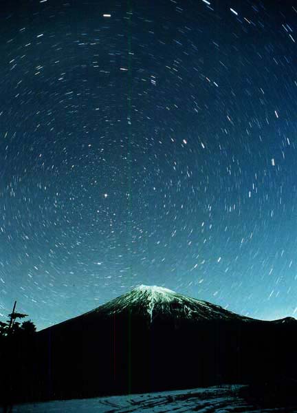 冬の富士と北極星 冬の富士山は南から、夏の富士山は北から見た姿です。 夏の富士山は登山口から山頂付近まで、山小屋の灯が連なっています。 |