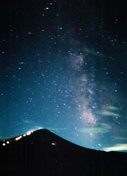 夏の富士と天の川 冬の富士山は南から、夏の富士山は北から見た姿です。 夏の富士山は登山口から山頂付近まで、山小屋の灯が連なっています。 |
