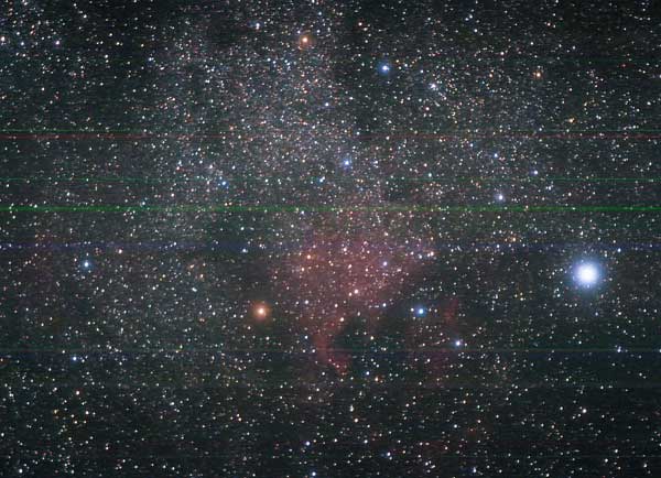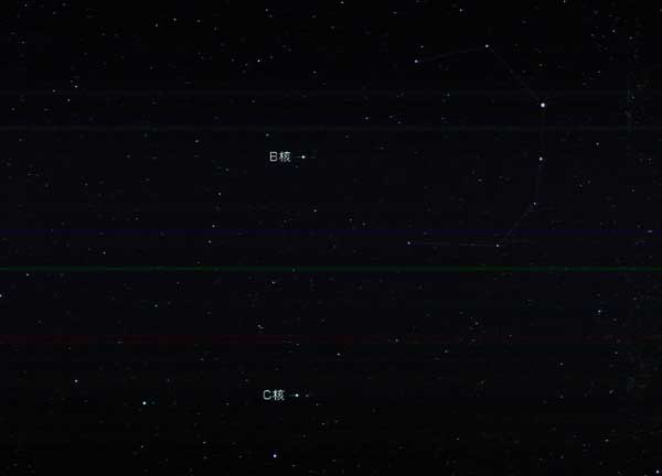 シュワスマン・ワハマン彗星B核C核とかんむり座 今年(2006年)の春に話題になった彗星です。 数十個に分裂した核のうち最も明るいのがC核,B核です。 右上のCを反転した形の星座がかんむり座です。 |