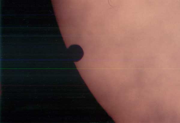 太陽面に食い込む金星 ほんの数分間の雲の切れ間に捕らえました。 ビー玉のような金星が太陽面に食い込んでいく不思議な光景に感動しました。 |