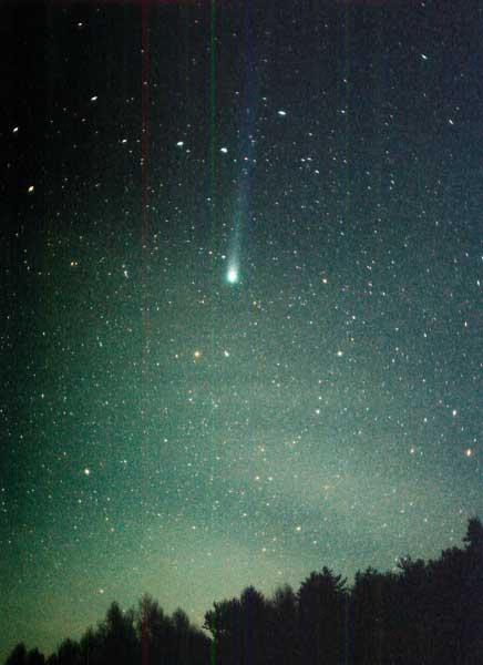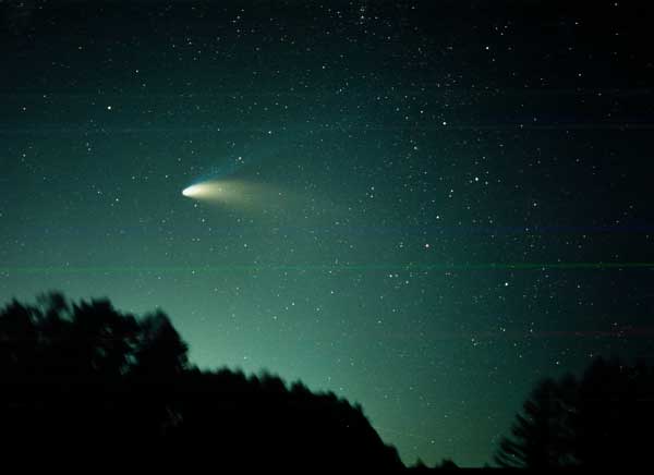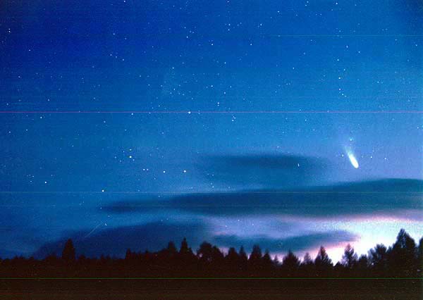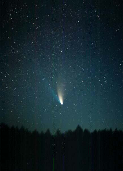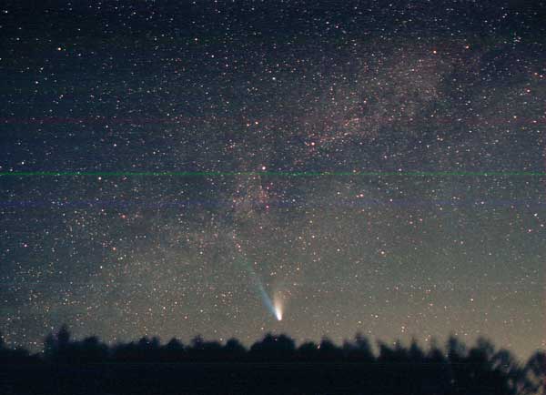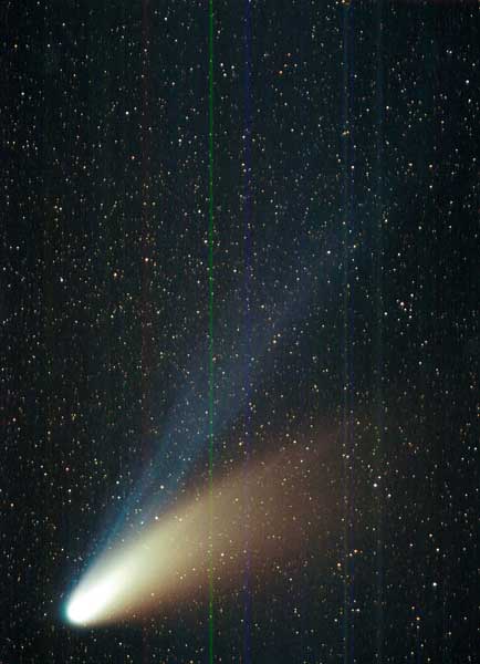明け方のヘールボップ彗星 20世紀を代表する大彗星であったヘールボップ彗星の明け方 最盛期の姿です。青いイオンの尾が鮮やかで、尾が二つに分かれて見えました。 |