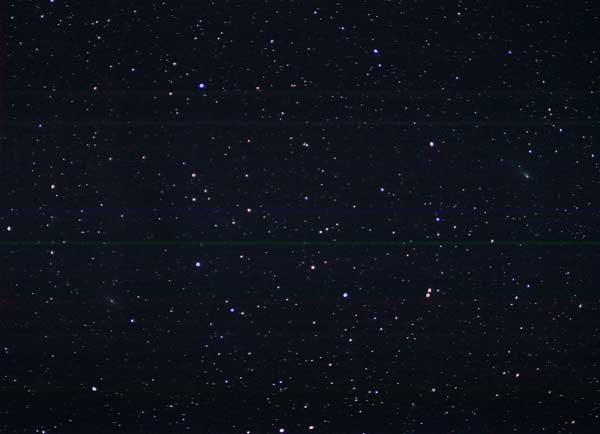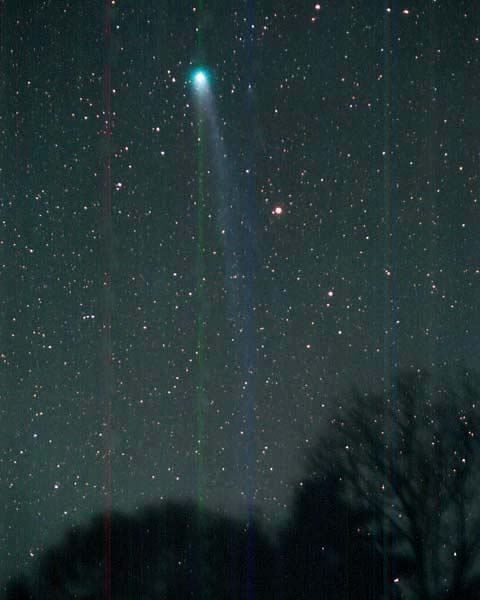 ニート彗星 3年前にはるか遠方で発見され、大彗星と騒がれた彗星です。 期待程には明るくなりませんせんでしたが、それでも何とか肉眼で確認出来ました。 とても薄いですが、イオンの尾が枝分かれしたり、折れ曲がったりしながら長く伸びてい るのが、わかるでしょうか? |
