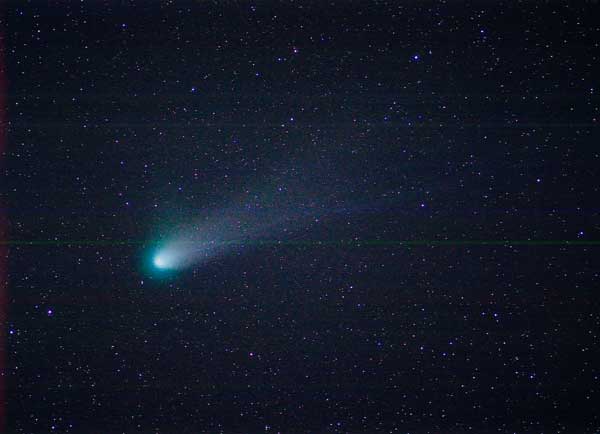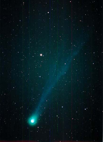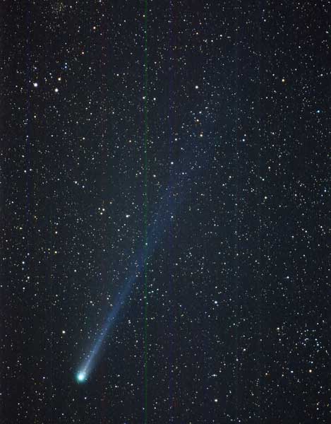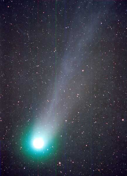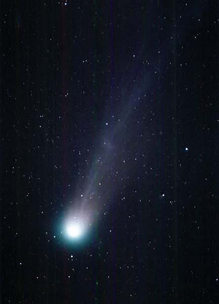 ヘールボップ彗星 長く画面の外まで伸びた青いイオンの尾と、やや幅広く広がった塵の尾。 共に複雑な構造をしているのが判ると思います。 |