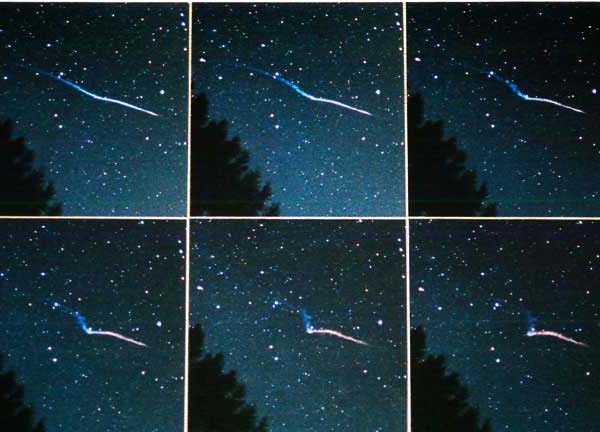 しし座流星群の流星痕の変化 25時36分30秒ころ出現のしし座流星群の大流星に伴う流星痕の変化を 捕らえました。わずか40秒余りの間に大きく変化している様子が分かります。 |