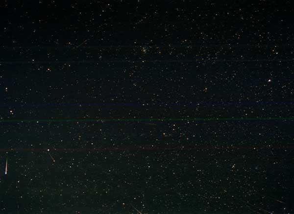 しし座流星雨 左側中程のしし座の頭を中心に放射状にかすかな流星を含め20個もの流星が 写っています。みなさん数えてみてください。右の明るい星は、こいぬ座のプロキオンです。 |