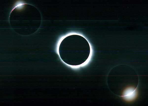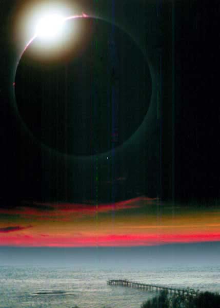 トルコ皆既日食ダイヤモンドリング リゾートホテルのバルコニーで地中海の波の音を聞きながら撮影した写真です(写真展ポスターの元写真です)。とても美しかった地上の風景との合成写真です。2009年には日本でも見られることが出来るので皆さんも是非ご覧下さい。 |