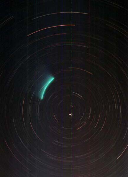 百武彗星 地球に最接近した百武彗星は北極星の隣に位置していましたが その長大な尾は北斗七星を通り抜けてしし座付近まで達していました。 見ていて怖いくらいの近さを感じました。 |