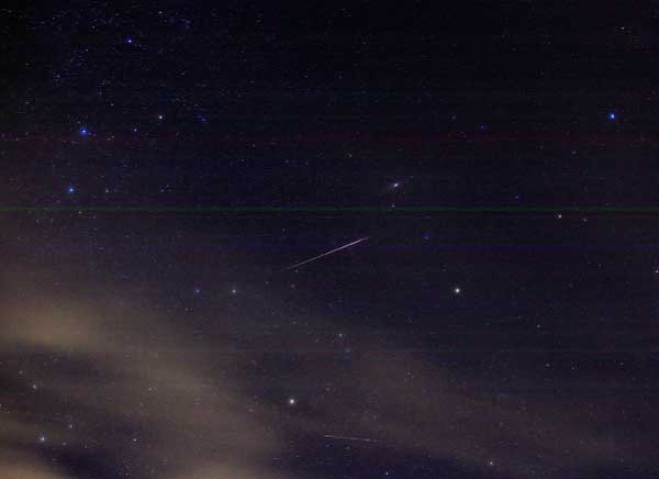 ペルセウス座流星群 少し雲がでてきていますが、どうしてもカシオペアからアンドロメダを背景に 流星を撮影したいと思い、ねばって撮影した写真です。薄い雲でにじんだ星の色も綺麗に撮影出来ました。 |