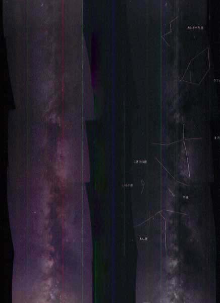 天の川銀河1/4 夏の夜に観察できる天の川を5箇所に分けて撮影して、デジタル処理してモザイク 接合してみました。これは、私達の天の川銀河を1/4くらいを見渡し範囲に相当します。 いつか1周分、つなげることが出来たら楽しそうです。 |