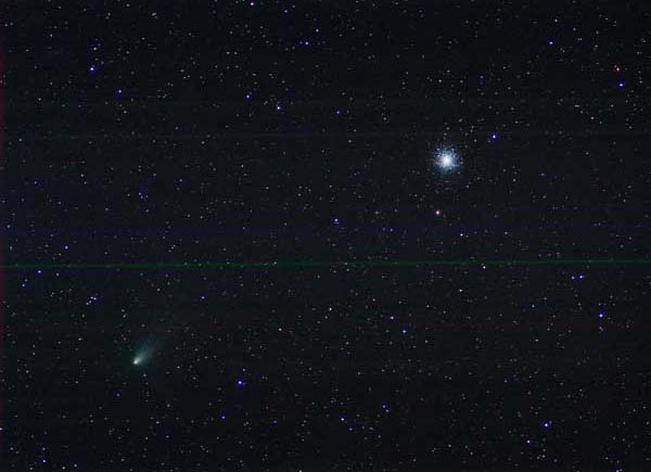 シュワスマン・ワハマン第3 彗星とM13 地球に接近中(光速で1分弱の距離)のシュワスマン・ワハマン第3 彗星のB核と およそ2万光年(光速で2万年の距離)にある恒星が10万個も集まった球状星団M13が並んでいます。 さらにM13の近くに、遠方の銀河NGC6207(数千万光年以上)も写っています。 |