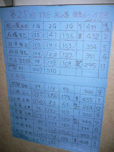 スコア │松の葉│レ-ン│1G│2G│3G│Tota│TAG │レ-ン│1G│2G│3G│Total│ │旦尾 │ │108│121 │140 │369 │阿部 │ │105│114 │115 │334 │ │石塚 │ │127│155 │166 │448 │小林(正)│ │165│155 │201 │521 │ │田中 │ │145│125 │137 │407 │小林(友)│ │99 │68 │87 │254 │ │丹羽 │ │122│150 │126 │398 │斉藤直樹│ │110│119 │145 │374 │ │守谷 │ │108│126 │135 │369 │斉藤文枝│ │132│129 │112 │373 │ │ │ │ │ │ │ │福原 │ │134│114 │135 │383 │ │ │ │610│677 │704 │1991│ │ │646│631 │708 │1985 │