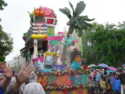 11時パレード待ったが雨で中止となった。しかし、雨用のちゃちーなパレードでお茶を濁された。