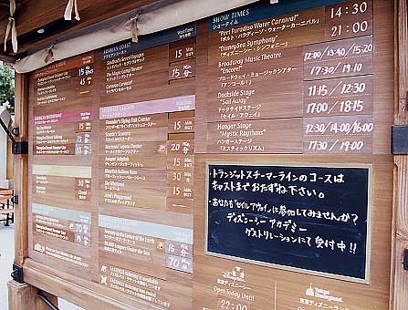 おみやげを車に置き”メディテレーニアンハーバー”昼のショーの”ポルト・パラディーゾ・ウォーターカーニバル”の場所取りへ。”メディテレーニアンハーバー”の広場の端に、各アトラクションの待ち時間をすべて掲載してあるボードがある。