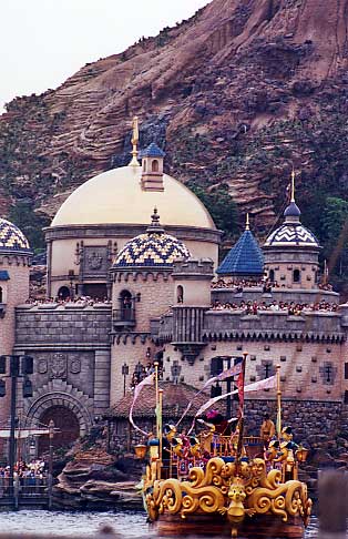 昼時間待ちで諦めた”ストームライダー”を乗りに行くため”ポートディスカバリー”へ。夜は待ち時間10分ぐらい。ランドの”スターツアーズ”に相当するアトラクション。特にキャラクタは出演無し。スターツアーズと異なるのは途中で雨が降ってくること。結構濡れてします。”メディテレーニアンハーバー”の夜のショー前は、船は止まってしまうので、歩いて”アラビアンコース”とへ。