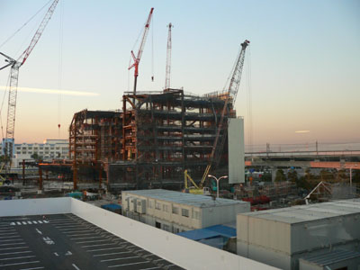 ホームにもクリスマスツリーが。夕焼けが綺麗でした。ディズニーランドホテルも形が出来てきました。