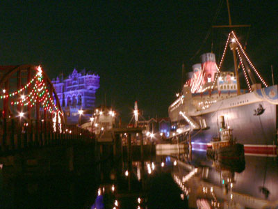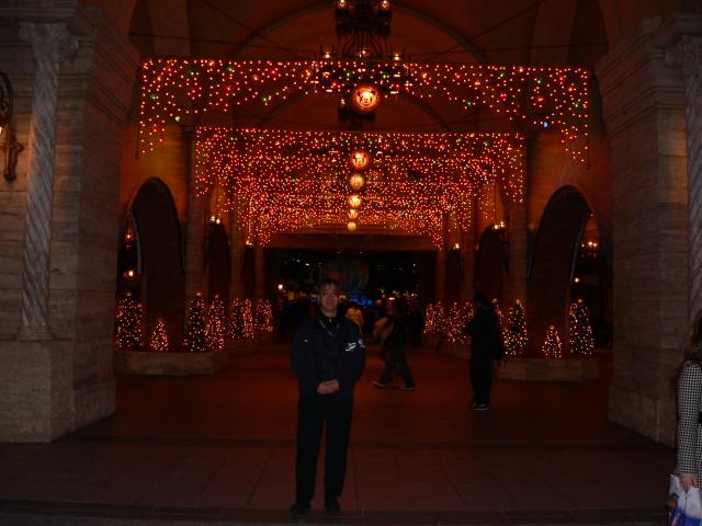 夕方から夜になり、イルミネーションが綺麗なパークを散策。夕食の会場に向かう。