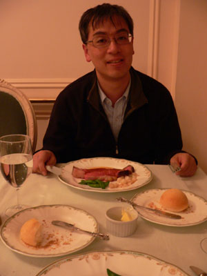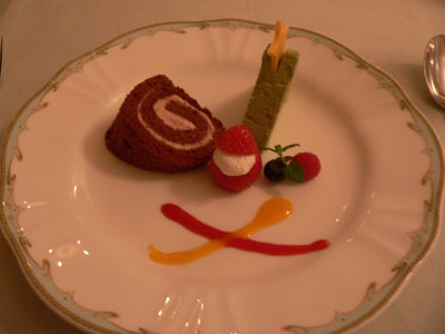 スモークサーモンのムース・デザートの盛り合わせ。まあ味より雰囲気!雰囲気!